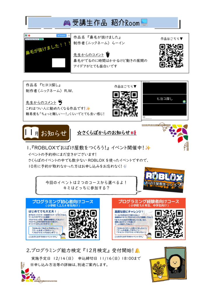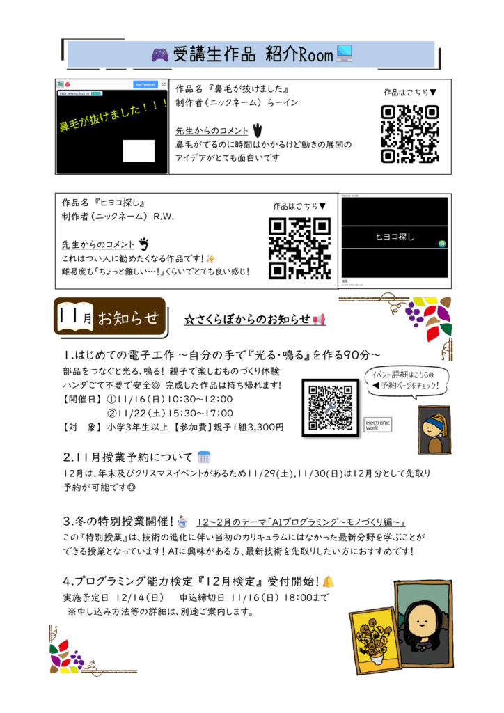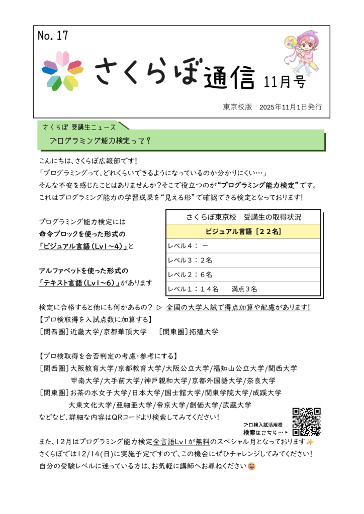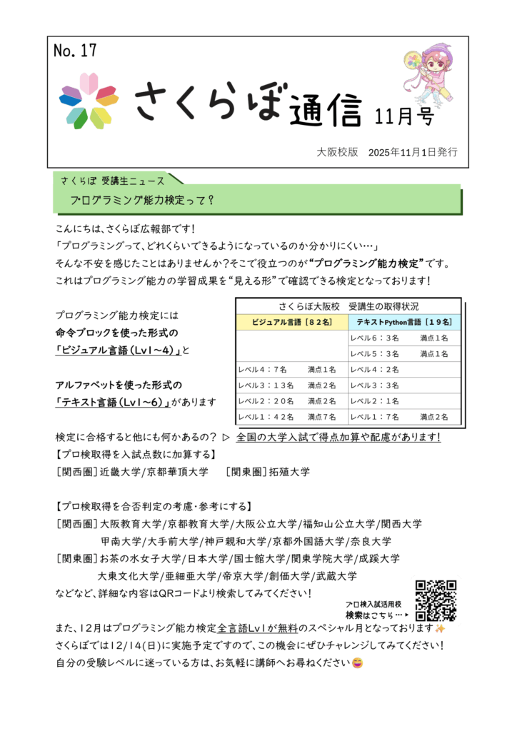 2025.11.01 さくらぼ通信-2025年11月号発行のお知らせ メルマガ 2024年7月より、月初に配信していた『さくらぼ通信』を紙面にして発刊しております。 紙面は、受講時にお渡しさせて頂きます。カラー版および先に読まれたい方は下記から閲覧可能です。 大阪校 大阪校 東京校 東京校 ご意見、ご要望等ある方は「HPのお問合せ」「公式LINE」等でお聞かせ下さい。 ★PDFダウンロードはこちら✨ 大阪校版🐙 東京校版🗼 [大阪校]10/19(日)臨時休校のお知らせ [大阪校]10/19(日)臨時休校のお知らせ [大阪校]11月&12月の授業・体験授業予定 [大阪校]11月&12月の授業・体験授 ...